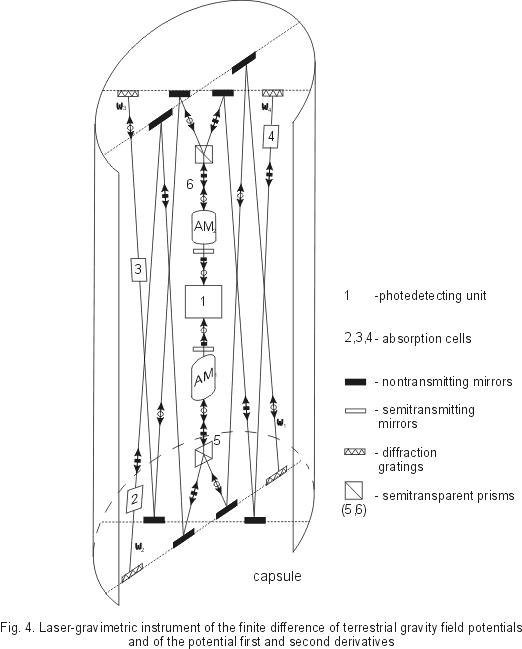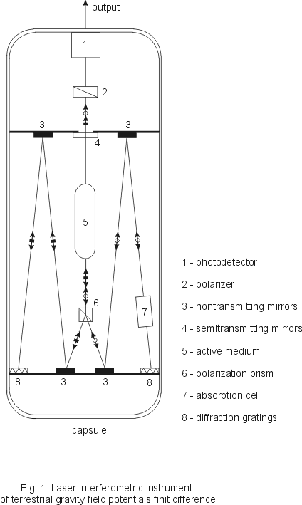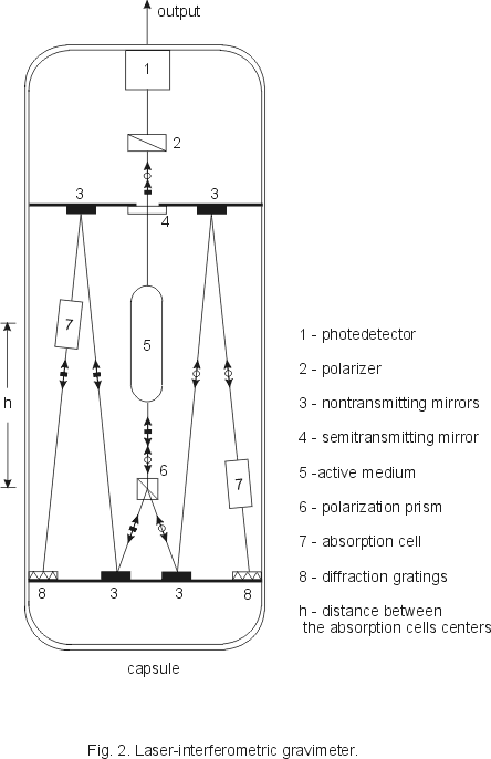 One can estimate the terrestrial gravity potential value in the "middle" point by measuring the generated frequences difference Dw using the phase method. The above-mentioned approach allows to create the laser-interferometric device for measuring the finite difference of Terrestrial gravity field potentials. The proposed instrument basic diagram is presented on fig. 1. Laser-interferometric gravimeter To get a gravimeter some changes should be introduced into design of laser-interferometric measuring instrument of gravity field potential, namely: to introduce the absorption cell in the left resonator to provide the absorption cells of the right and left resonators location in the points with different gravitational potential values in the case of the device vertical position (fig. 2). Let the potential in the point of the left absorption cell location be equal to j1, and in the point of location of the right one - to j2, the distance between the absorption cells centres being equal to h. In this case, according to formula (2), the left and right resonators will generate optical radiation with different frequences, therewith the frequences difference Dw will be determined by the gravity potentials difference Dj: